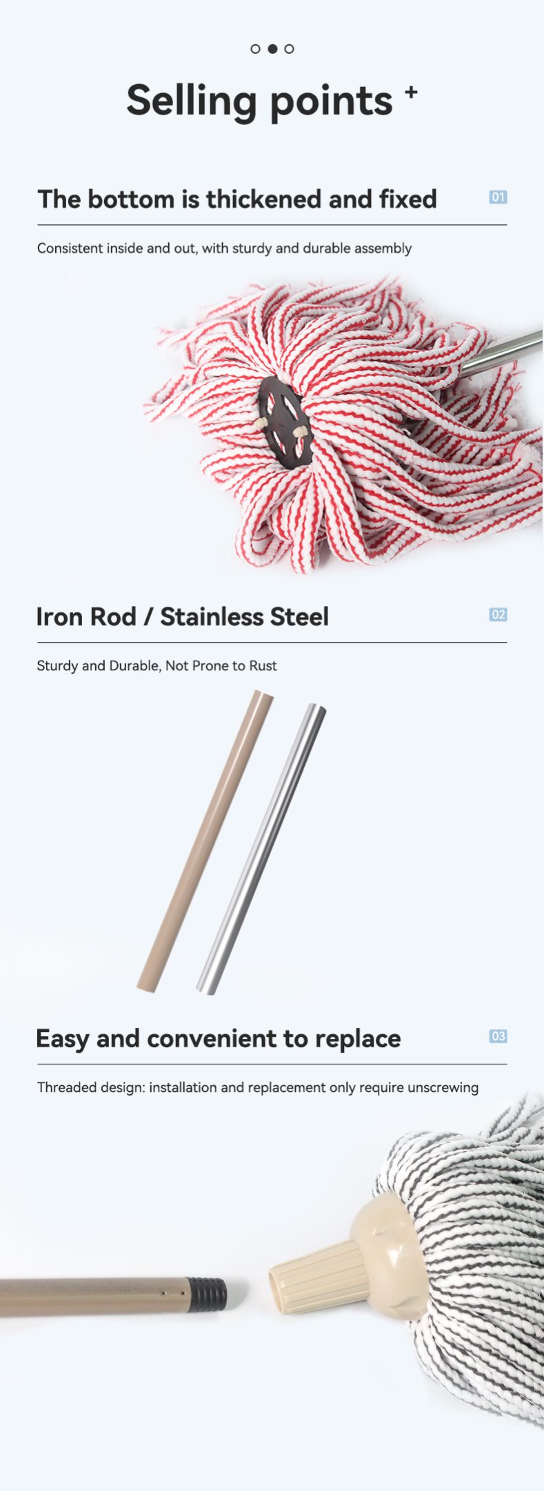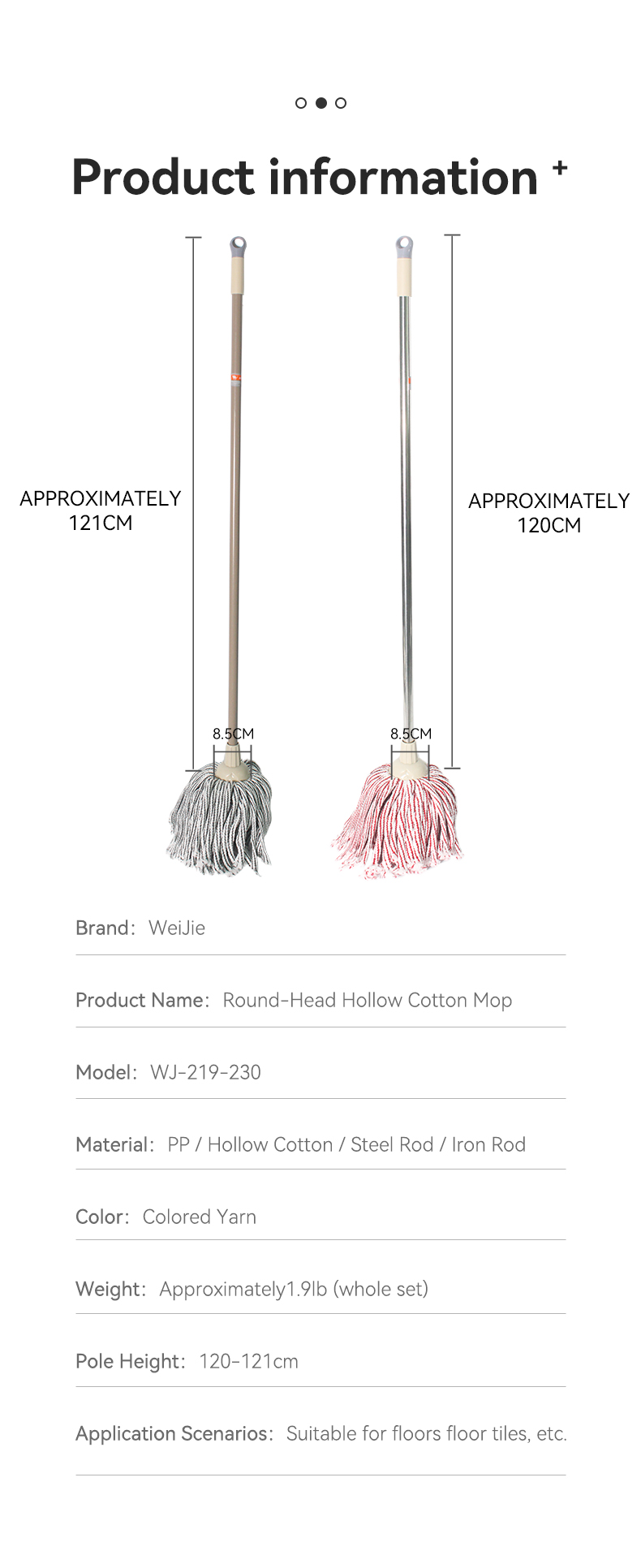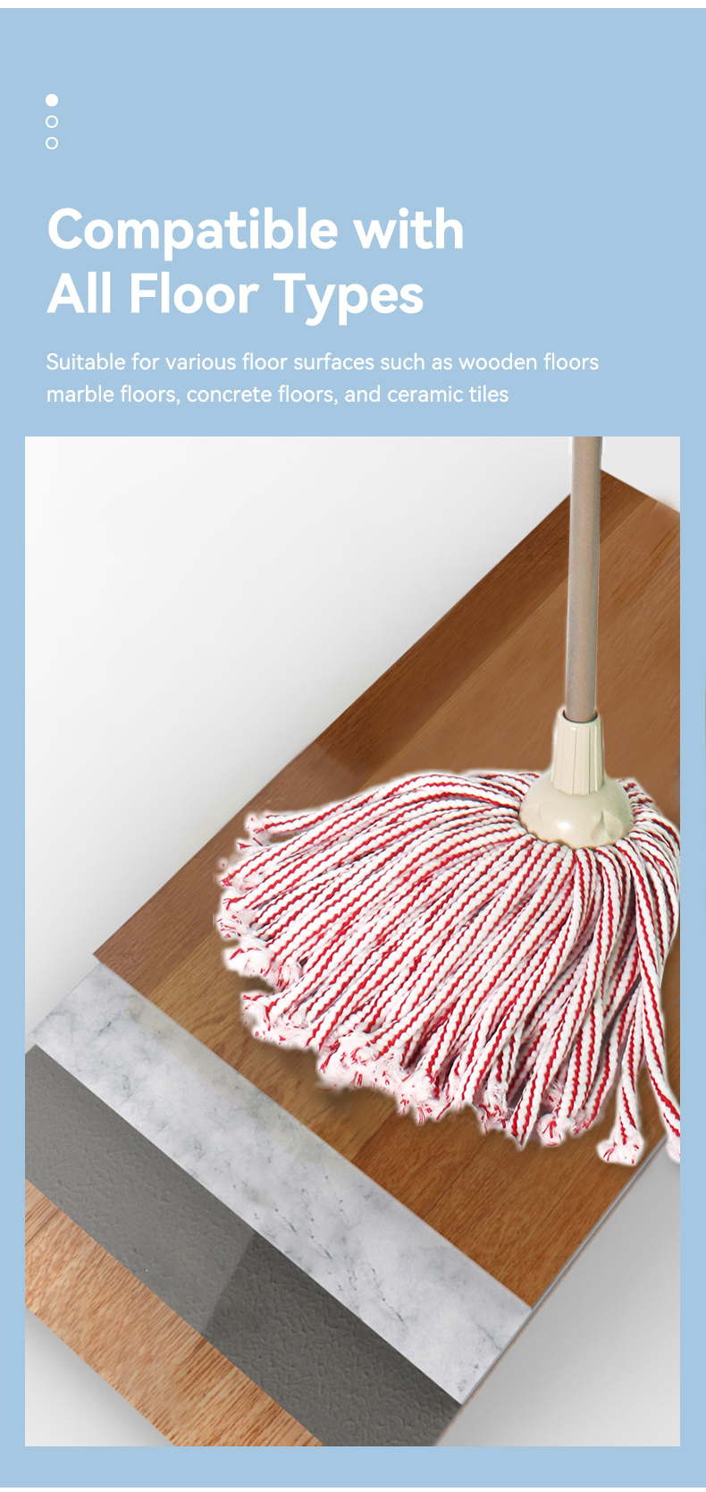 This traditional round-head hollow cotton mop comes in pink-white or gray-white stripes: its hollow cotton design boosts absorbency, and the classic round head covers more area per swipe. Pick pink-white for a bright look, or gray-white for stain resistance — durable, soft, and ideal for all home floor types.